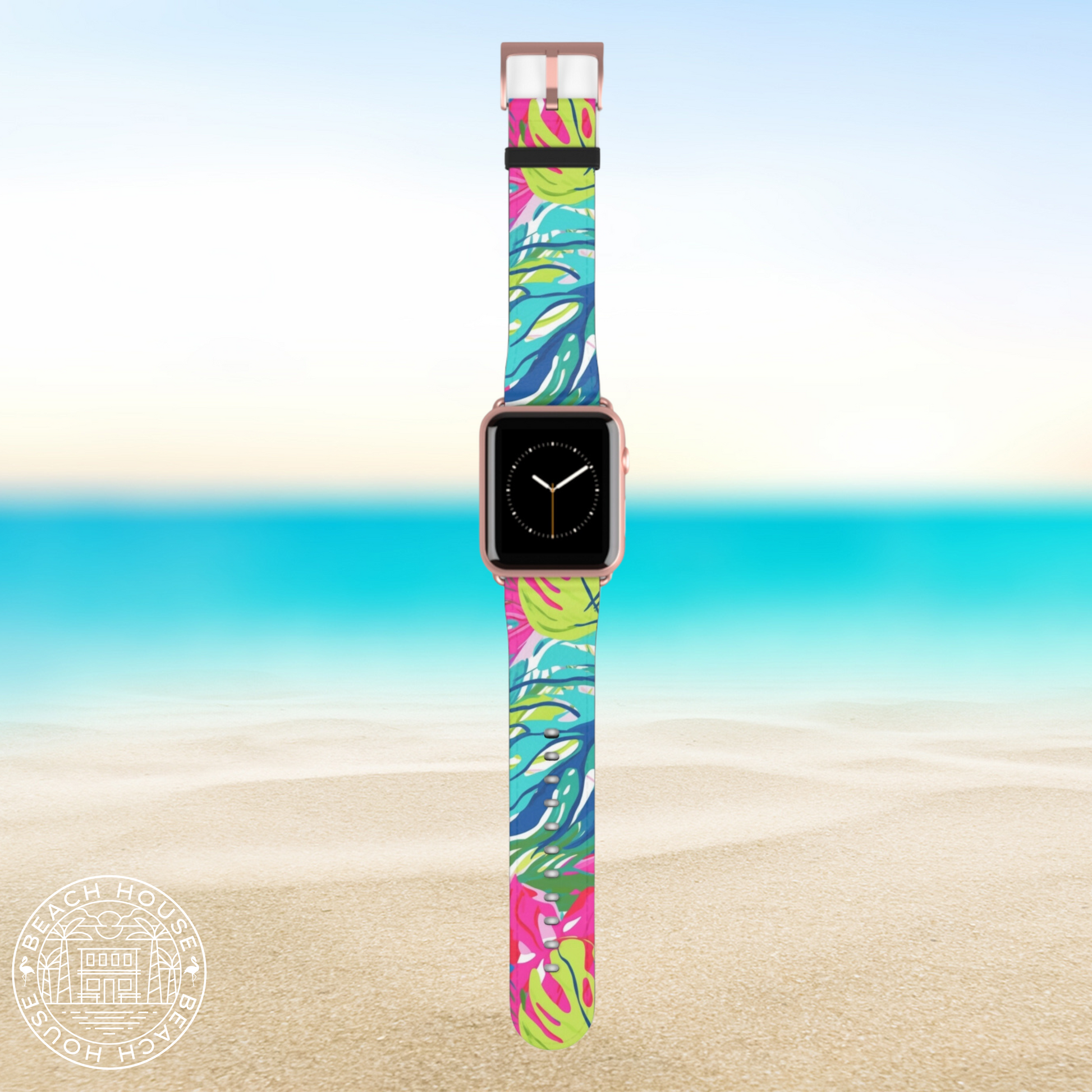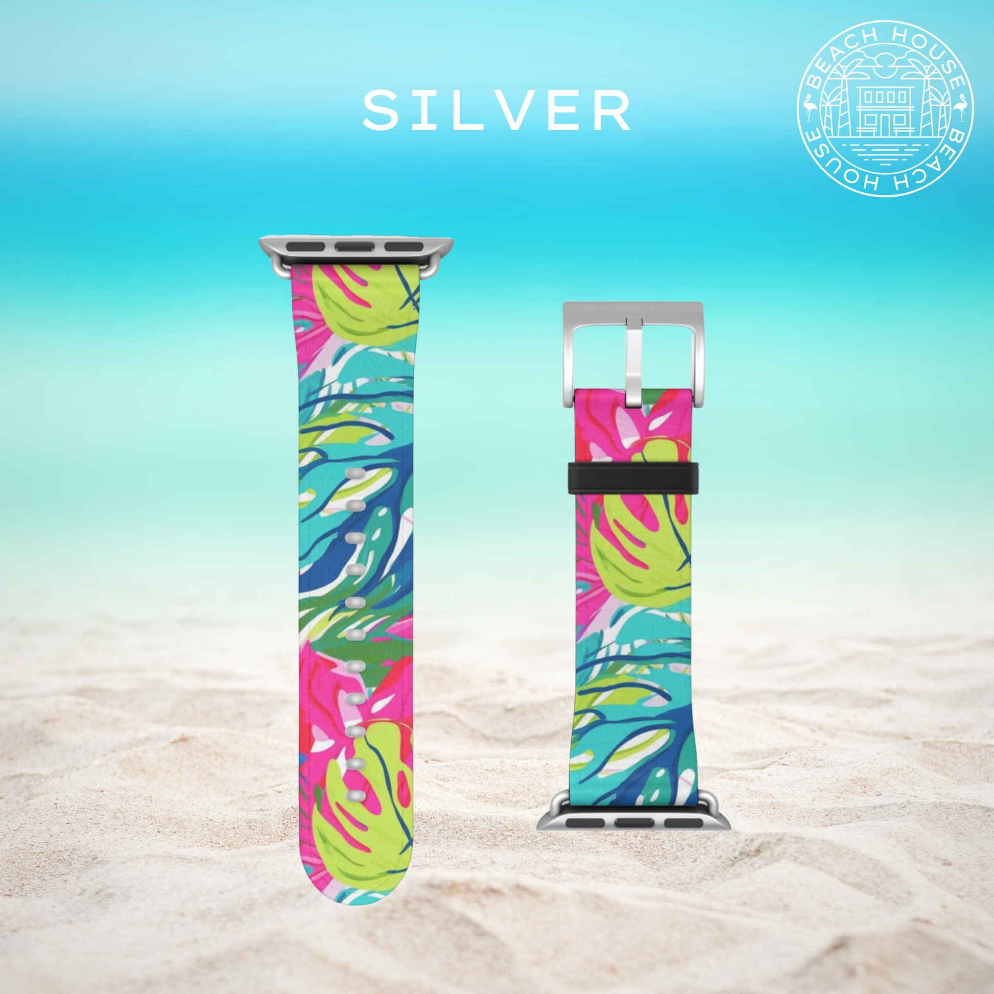 Introducing the Perdido watch band, the perfect way to showcase your watch and keep paradise close by! Custom, tropical inspired watch band design. Upgrade your watch with ease. This band comes equipped with adapter hardware designed specifically for your Apple® Watch model. These high quality, animal-friendly faux leather watch straps are the extra missing punch to flirty outfits and nights out.