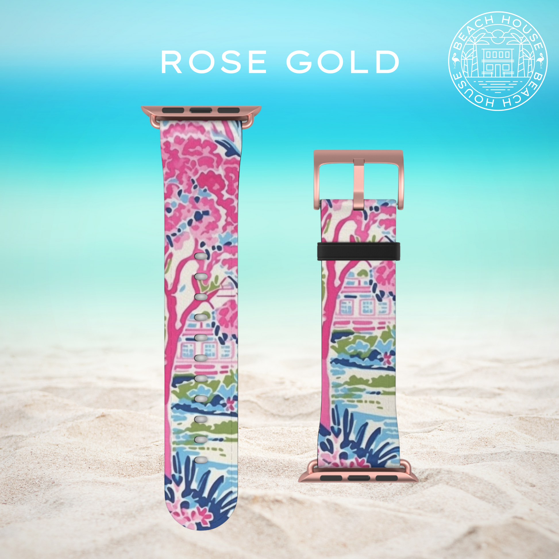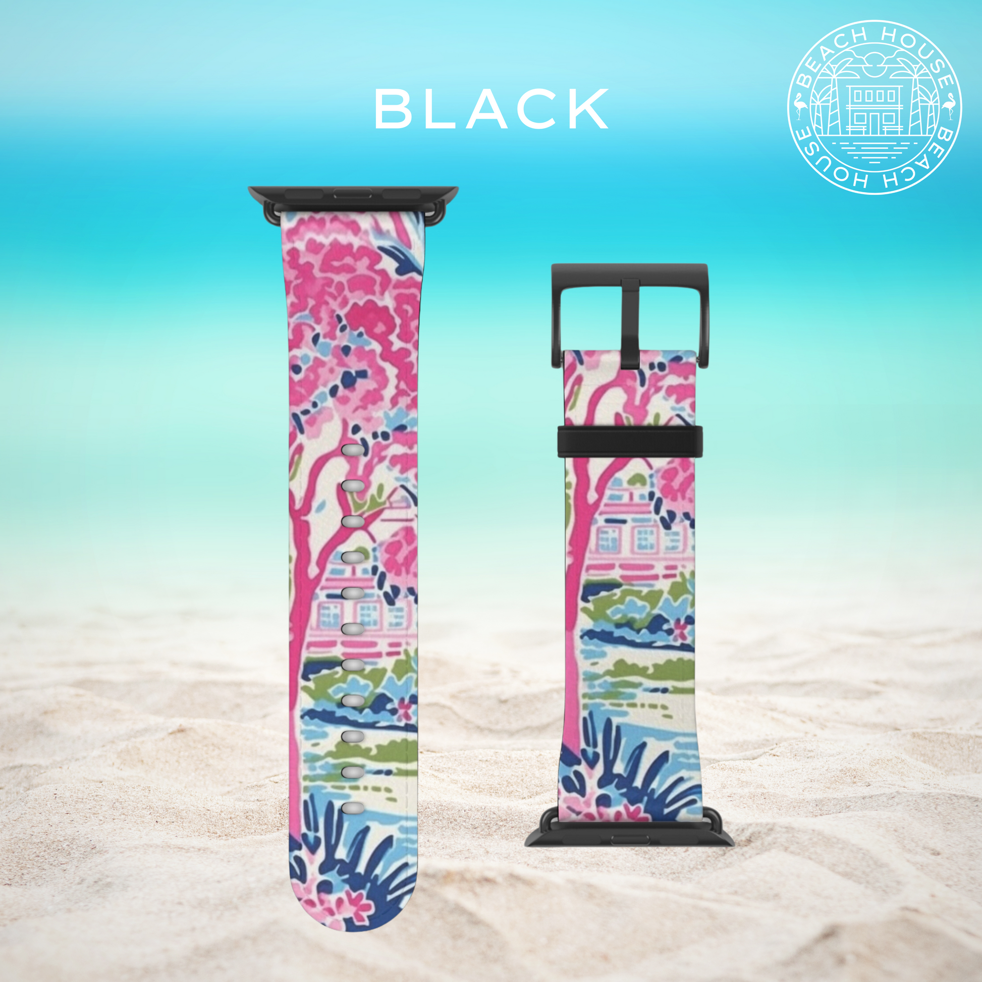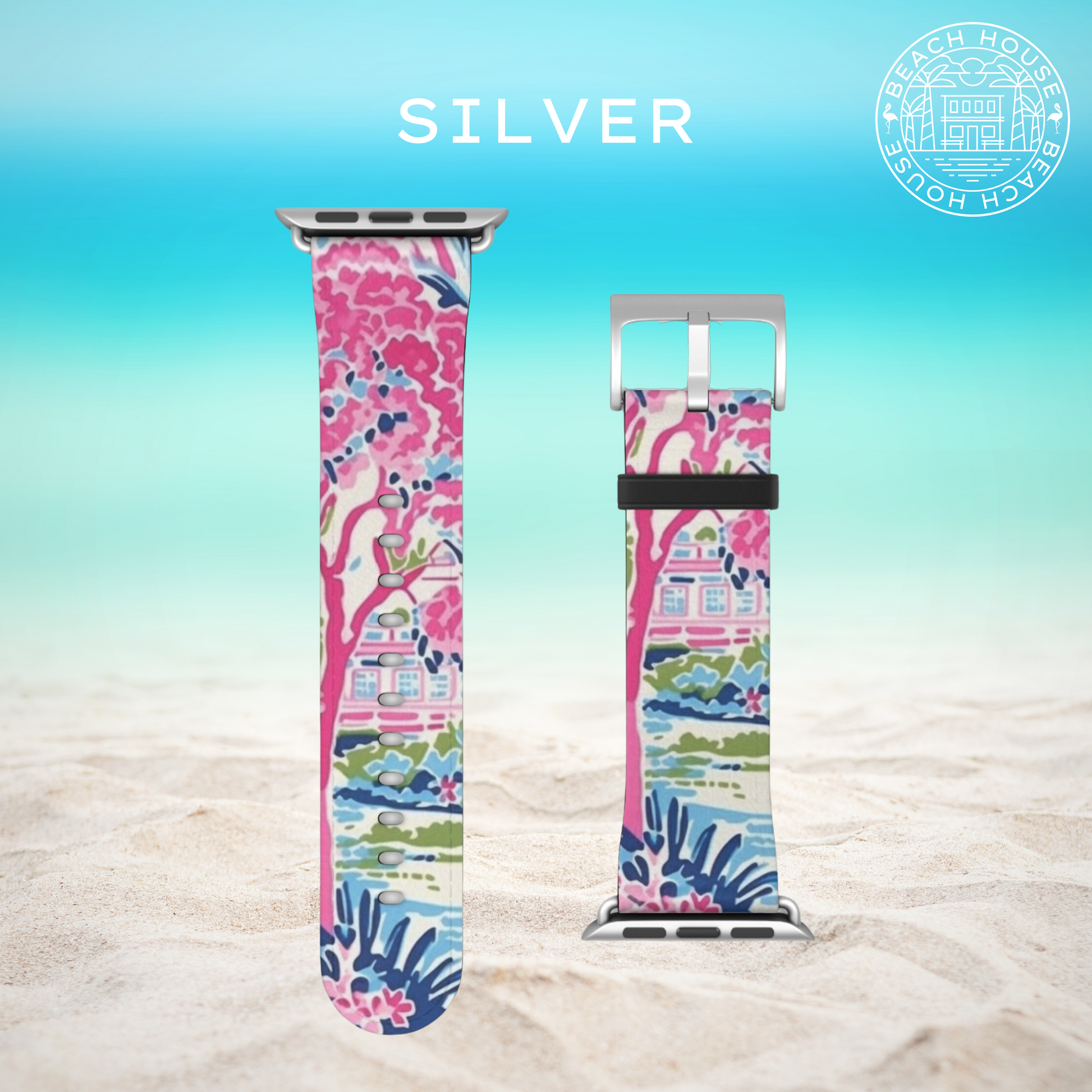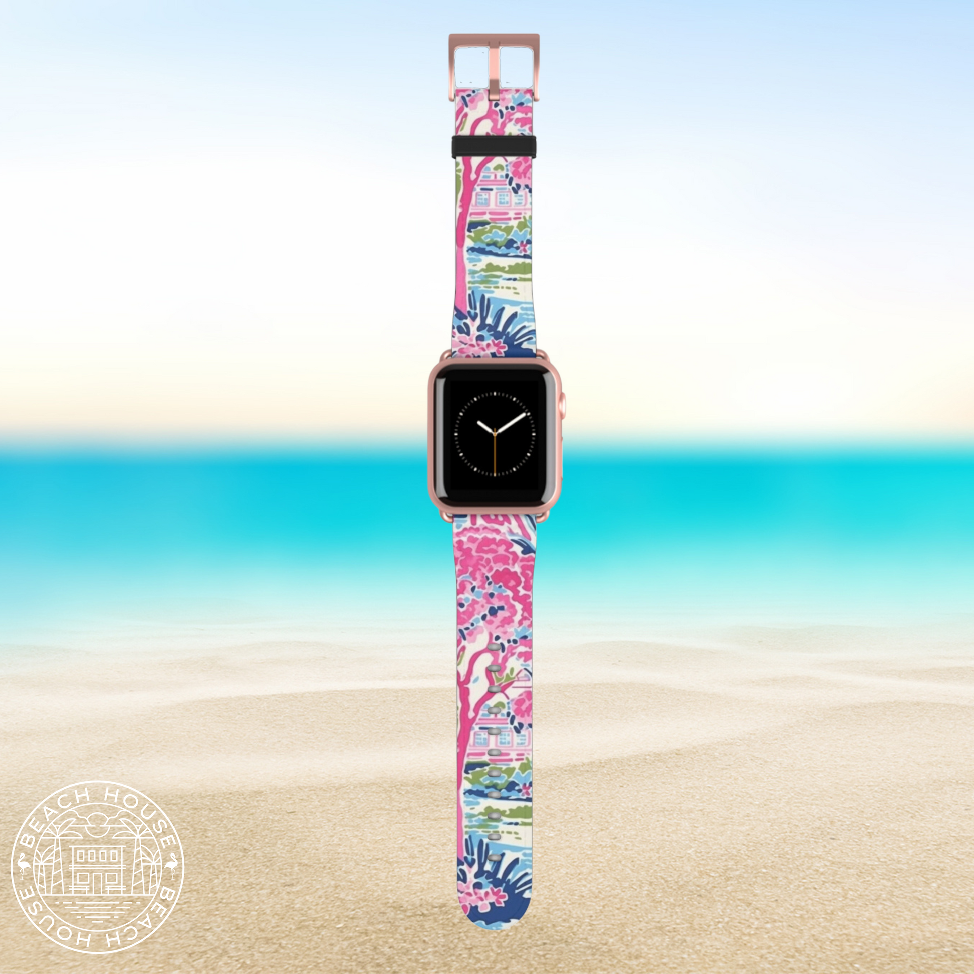 Introducing the Amelia watch band, the perfect way to showcase your watch and keep paradise close by! Custom, tropical inspired watch band design. Upgrade your watch with ease. This band comes equipped with adapter hardware designed specifically for your Apple® Watch model. These high quality, animal-friendly faux leather watch straps are the extra missing punch to flirty outfits and nights out.